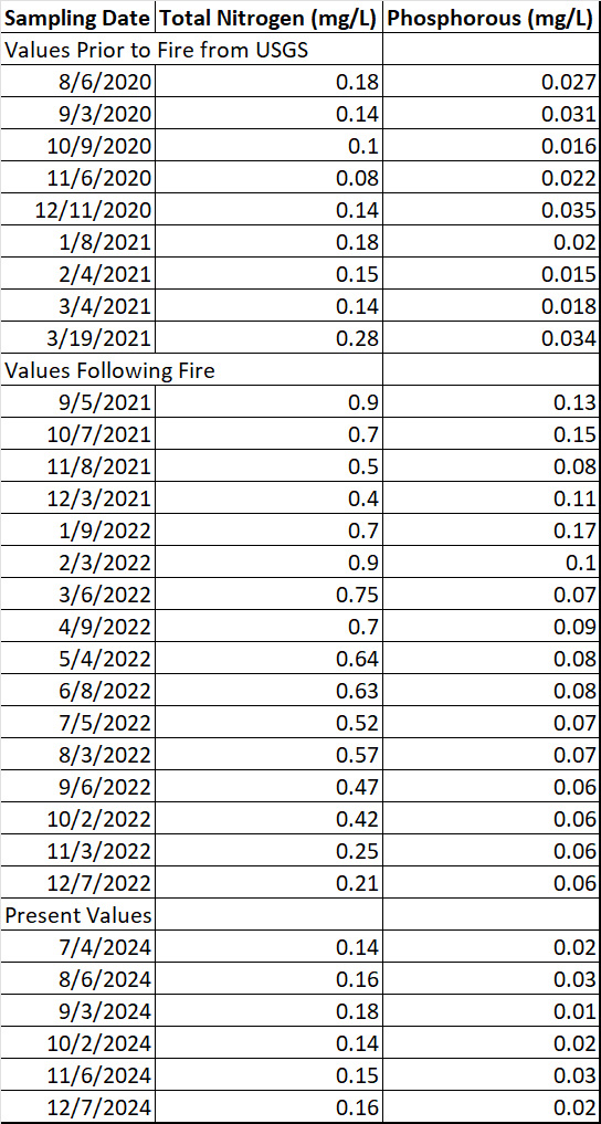 As you can see, nitrogen and phosphorus levels following the fire were significanly higher. The team is continuing to monitor water quality levels and currently nitrogen and phosphorus levels have come down to normal levels.